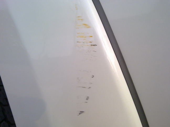 ลักษณะร่องรอยนี้ตามภาพ คือ ล้อแม็กซ์เป็นรอยกระแทกลึก ข้างรถเป็นรอยขูดเบียดเสา หินกระเด็นโดนฝากระโปงลึกถึงเนื้อเหล็ก รอยขีดข่วนทั่วไป
