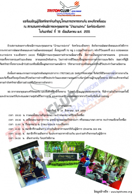 ตอบ: ขอเชิญร่วมทำบุญอาหารกลางวัน ณ บ้านบางปะกง