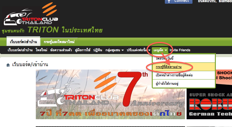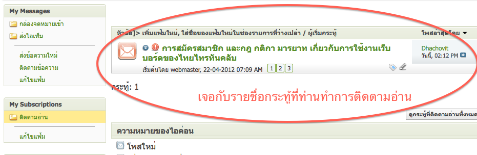 5. เมื่อเข้าเว็บครั้งต่อไป หากต้องการเปิดดูกระทู้ที่ท่านติดตาม ให้คลิกที่เมนู "เมนูลัด -> กระทู้ที่ติดตามอ่าน"