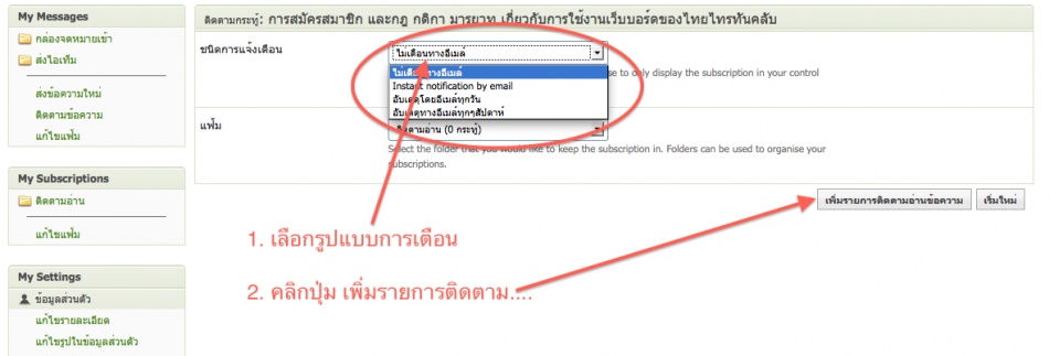 1. เปิดกระทู้ที่ท่านสนใจ แล้วคลิกที่เมนู "เครื่องมือจัดการกระทู้ -> ติดตามอ่านกระทู้นี้"
