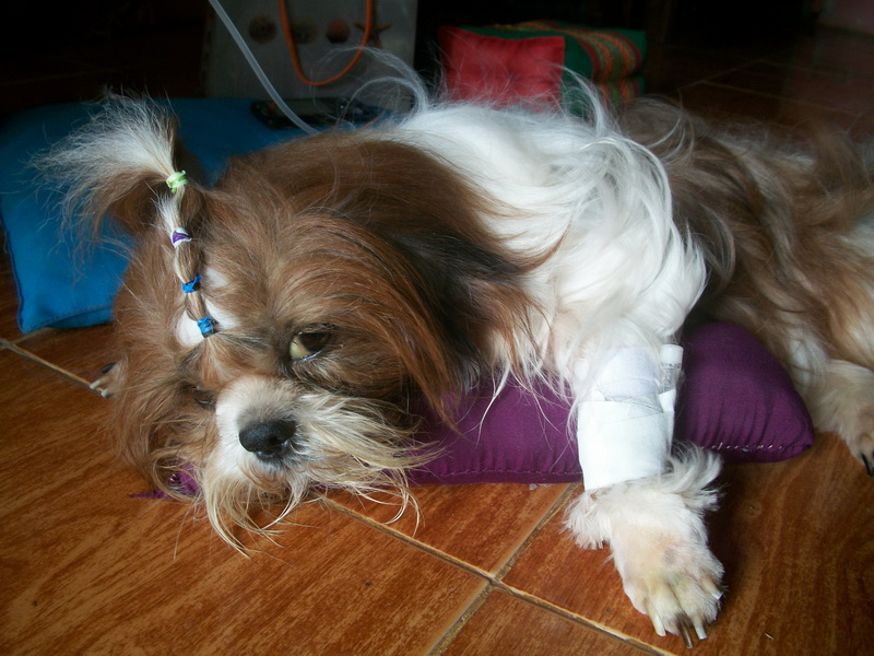 จนทำให้ เม็ดเลือดแดงลงตำมาก ถึง 8 จากปรกติคือ 30-40 ตัวซีดเหลือมาก ซึ่งอาจจะทำให้ช็อคได้ทุกเวลา เมือ่วันศุกร์ที่ผ่านมา พาไปหาหมอที่โรงบาลสัตว์ ม.ขอนแก่น ก็ช็อคไป 2 รอบ หมอต้องใช้เครื่องช่วยหายใจ ดีที่ยังกลับมาได้ ตอนนี้ต้องให้น้ำเกลือตลอดเวลา และคอยฉีดยา คุมใว้เพื่อรักษาระดับเม็ดเลือดและกันช็อค