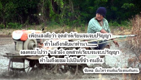 เป็นวิถีชีวิตที่น่าศึกษา เอาเป็นแบบอย่างน้าเขานะ มีรายได้จากการทำนา ปีละ 1-2 ล้านบาท (ตกลง 1 หรือ 2 ) ไม่ธรรมดาหรอก แต่จะว่าไปแล้วทั่ว ๆ ไปน่ะ จบปริญญามาแล้วทำไมต้องไปเป็นขี้ข้าเขา เพราะไม่มีใครเขารับเราไปเป็นเจ้านายนี่ครับ มันเริ่มจาก 1 ก่อนเสมอล่ะ แต่หากคิดให้ดีไม่ต้องจบปริญญาก็ได้ถ้าคิดจะทำนา แค่มีสติปัญญาดี แข็งแรง อดทน ขยันและไม่ถูกนายทุนขี้โกง