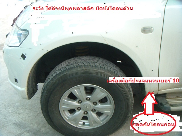 1. ถอดบังโคลนด้วยปะแจแหวนเบอร์ 10 อย่าลืมพุกพลาสติกใต้ล่างด้วยนะครับ ต้องงัดดีๆ ไม่งันหัก ถ้าหักก็ตัวละ 10 บาท