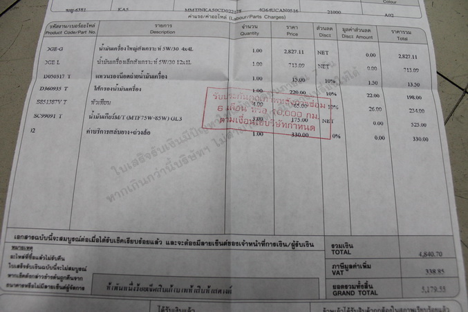 ดูจากรายจ่ายแล้ว ราคาสูงที่น้ำมันเครื่อง ได้สอบถามเจ้าหน้าที่ที่ศูนย์แล้ว คราวหน้าหิ้วน้ำมันเครื่องมาเองได้