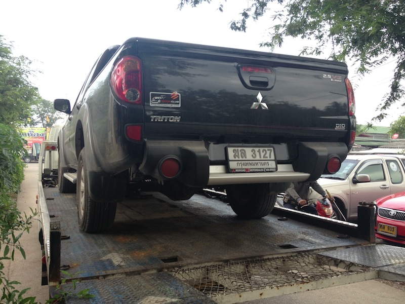 ประมาณเที่ยงรถสไลด์มาถึงจัดแจงเอารถขึ้นไป ส่งศูนย์มิตซูบิชิ มุ้ยฮวดมอเตอร์เซลล์ นครปฐม เสียค่าส่วนต่างค่ารถยกไปอีก 250 บาท เนื่องจากไม่ใช่ศูนย์บริการที่ไกล้ที่สุด (แต่เป็นศูนย์ที่ผมรับรถที่นั่น และสะดวกเดินทางมากที่สุด)