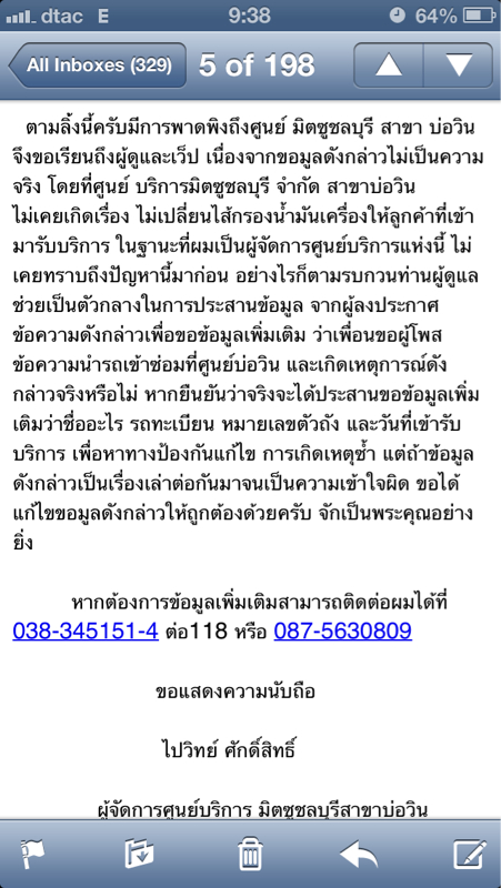 เพื่อนผมโวยวายเสียงดังเพื่อต้องการให้ลูกค้ารายอื่นได้รับรู้ด้วย ผจก.ศุนย์ออกมาเคลีย์และยอมรับในการกระทำดังกล่าวแถมยังเสนอจะเปลี่ยนน้ำมันเครื่องแบบ 100%ให้ฟรีอีก 1 ครั้ง