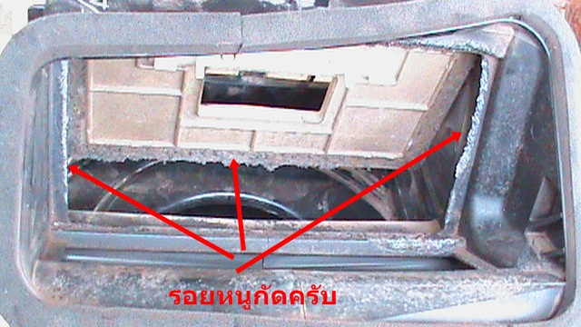 จะเห็นรอยหนูกัดแถวขอบลิ้นช่องรับอากาศจากนอกรถ ทำให้อากาศรั่วเข้าได้ครับ เลยทำให้ได้กลิ่นจากนอกรถ ผมจะปิดตายรูนี้เลยครับ