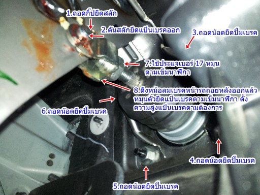 หม้อลมเบรคออก 4 ตัว แล้วหมุนนอตตั้งแป้นเบรคตามเข็มนาฬิกาเพื่อให้แป้นเบรคต่ำลง