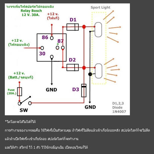 ฮิๆๆๆ ต่อไม่ผิดครับ....ใช้งานมา 5 ปีกว่าละ พึ่งจะเป็นเมื่อวานเอง...ต่อผ่านรีเลย์ ใส่เกียร์ถอย ไฟติด พร้อมกล้องมองหลัง และทำสวิทสำรองปิดเปิดควบคุมไฟสปอร์ดไลท์ด้วย หากใช้เกียรถอยหลังให้ไฟสปอร์ดไลท์ติด หรือให้เปิดสวิทติดยามที่เราต้องการเฉพาะตอนกลางคืนที่เราเปิดไฟหรี่เท่านั้น หากถอยตอนกลางวัน กล้องกับไฟหลังติดอย่างเดียว ไฟสปอร์ดไลท์ไม่ติด ...ทำวงจรแบบนี้...ใช้งานมา 5 ปี กับอีก 20 วันละ