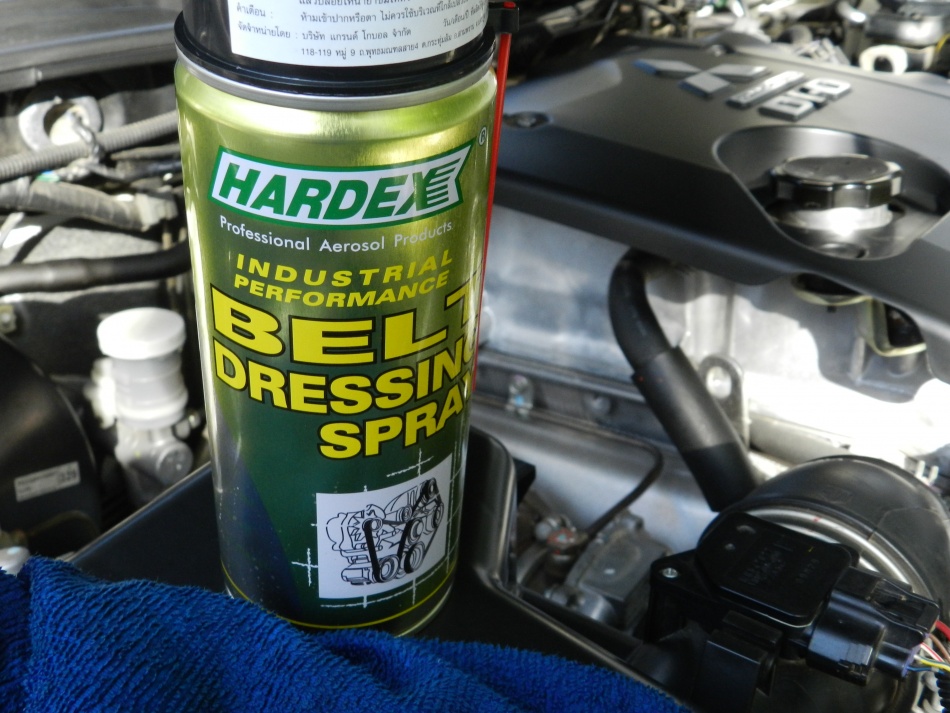 พอดีผมไปเดินLotusเห็น สเปรย์บำรุงรักษาสายพาน Hardex ราคาร้อยกว่าบาทเลยลองซื้อมาใช้ดู เพราะรู้สึกรำคาญเสียงสายพานที่มันดังอี๊ดๆๆๆๆถึงจะดังเบาก็เถอะรถใช้มา 3 ปีกว่า 36,000 โลเช็คดูสายพานก็ไม่หย่อน จึงจัดการเอาน้ำฉีดให้สะอาดพอแห้งก็เอาสเปรย์พ่นลงที่สายพานให้ชุ่มนิดหน่อยพอดูแล้วมันซึมได้ที่ก็สตาร์ทเครื่องไว้ประมาณ 10 นาทีเสียงสายพานที่เคยดังเงียบเลยครับ แต่ไม่รู้ระยะยาวจะดังอีกหรือไม่