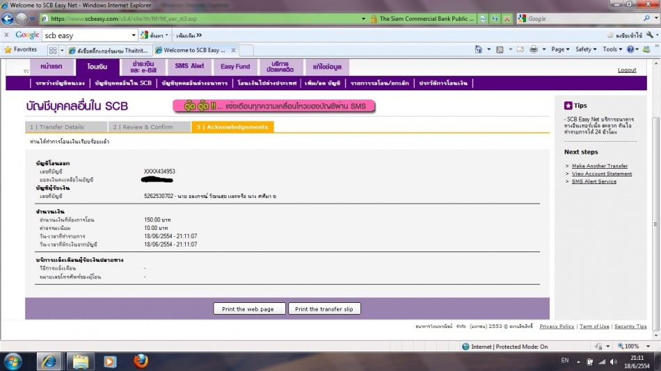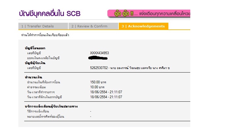 2. ผมจะโอนผ่านมือถือ จึงไม่มีสลิปให้ถ่ายส่งไปน่ะครับ แต่ระบบจะส่งข้อความรายงานผลการโอนเข้ามือถือ