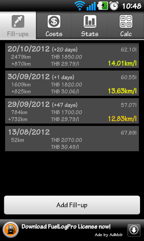 ตรง add fill up ก็คือ กรอกรายละเอียดของการเติมน้ำมันในแต่ละครั้งครับ โดยหน้าตาจะขึ้นกับที่เราเลือกตั้งค่าเอาไว้