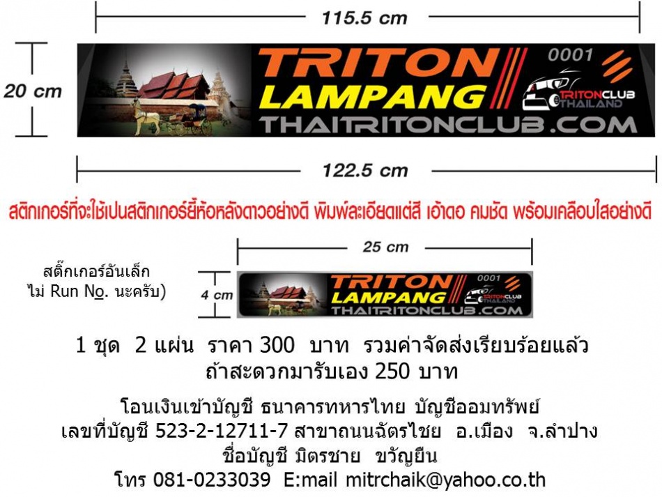 ตอนนี้สติ๊กเกอร์ได้ให้ร้านออกแบบ และจัดทำเสร็จเรียบร้อยแล้วครับ (ตามภาพและรายละเอียดด้านล่าง) 1 ชุด มี 2 แผ่น แผ่นใหญ่ติดกระจกหน้ารถ มีภาพสัญญาลักษณ์ของTritonลำปาง หลักๆ 2 ภาพ ภาพด้านหลังสุดเป็นรูปวัดพระธาตุลำปางหลวง โดยมีรูปรถม้าลำปางจอดอยู่หน้ากำแพงวัด. สติ๊กเกอร์แผ่นเล็กมีกรอบเส้นสีเงินบร็อนท์โดยรอบของกรอบ แต่ไม่ Run No. ส่วนสติ๊กเกอร์แผ่นใหญ่ จะ Run No. โดยเริ่ม จาก 0001