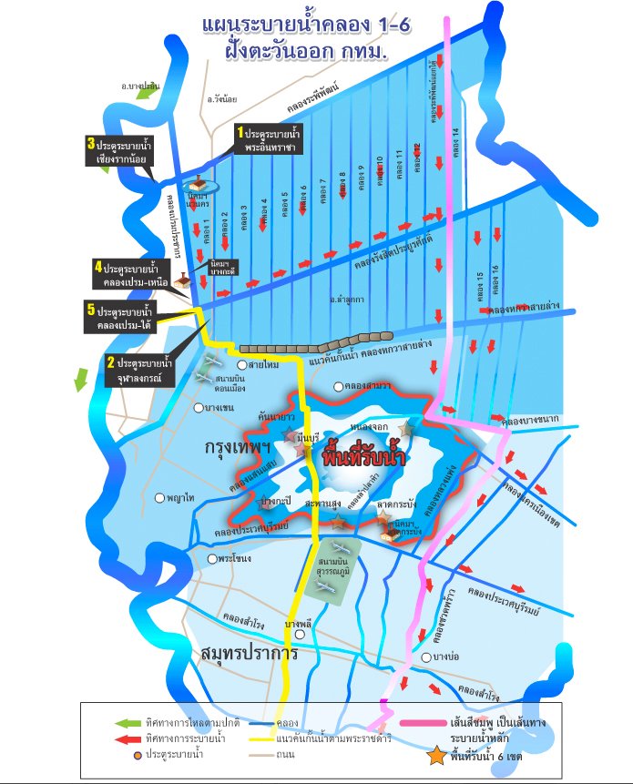เส้นทางระบายน้ำลงอ่าวไทย (ผ่านทางตะวันออก) ลองสังเกตเส้นสีชมพูดีๆ นะน้าๆ นั้นคือจะผ่านนิคมอุตสาหกรรมต่างๆ อีก 5 แห่ง ซึ่งเวลโกรว์ ฉะเชิงเทราคือหนึ่งในนั้นด้วยครับโผม