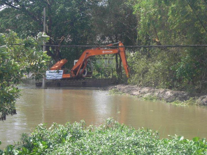 สถานการณ์บางน้ำเปรี้ยวตอนนี้ในคลองนครเนื่องเขตได้ใช้รถแบ็คโฮว์เร่งทำคันกั้นน้ำและเก็บผักตบชวาขึ้น