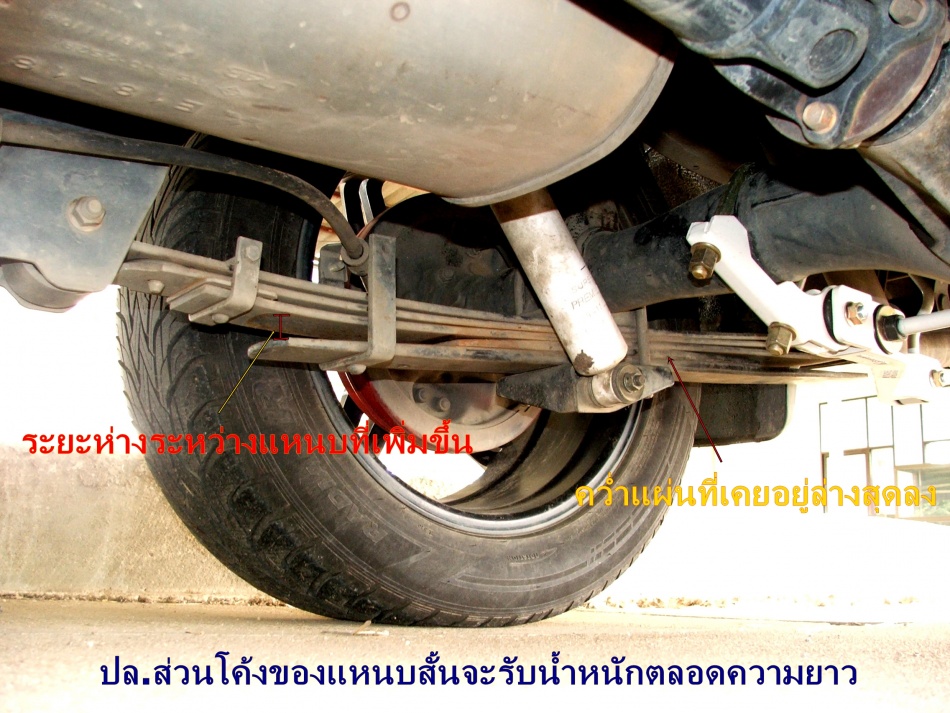 ตอนนี้ลองถอดแผ่นที่ 2 (ยาว) ออกดูก่อนครับ รู้สึกว่าอาการท้ายเด้ง กระโดดจะลดลงนิดหน่อยครับ แต่ยังไม่หายขาด แต่ว่าผมไม่ได้กลับแหนบตัวสั้นลงนะครับ ว่าจะลองใส่แผ่นยาวกลับ แต่ว่าสลับไว้ล่างสุด หรือไม่ก็หาแผ่นเหล็กมารองเพื่อถ่างแหนบดูก่อนเหมือนกับอ้ายบ่าวแวง แต่งแบบถืกๆ หม่วนหลายเด้อครับ