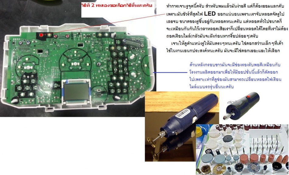 ไม่ต้องแยกชิ้นก็ได้ครับเปิดฝาหลังแล้วแง้มแผ่น boardออกนิดเดียวแล้วเอา LEDตัวเล็กสอดเข้าไปปิดฝาหลังจบครับผมก็ทำแบบนี้ แต่ถ้าจะใส่ 7 Segment บอกตำแหน่งเกียร์ สงสัยต้องถอดตามที่น้าคม Post ไว้ครับ.