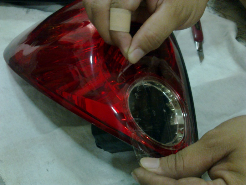 ถอดโคมมาล้างทำด้วยน้ำยาล้างจานให้สะอาดเลยครับ แล้วจัดการแปะส่วนที่เราไม่ต้องการให้โดนสีด้วยสก๊อตเทปใส หรือถ้าใครมีกระดาษกาวก็ยิ่งดีเลยครับ