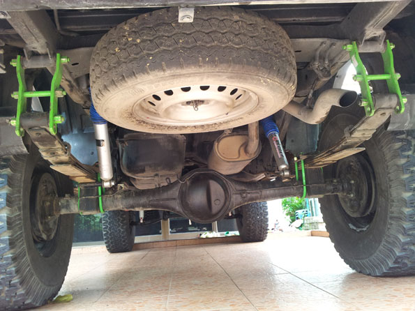 ย้ายแหนบขึ้นมาเทินเพลาก็ได้ราวๆ 4 นิ้วแล้วครับ + โตงเตงที่ยางกว่าเดิมอีกราวๆ 5-6 นิ้ว อิอิ