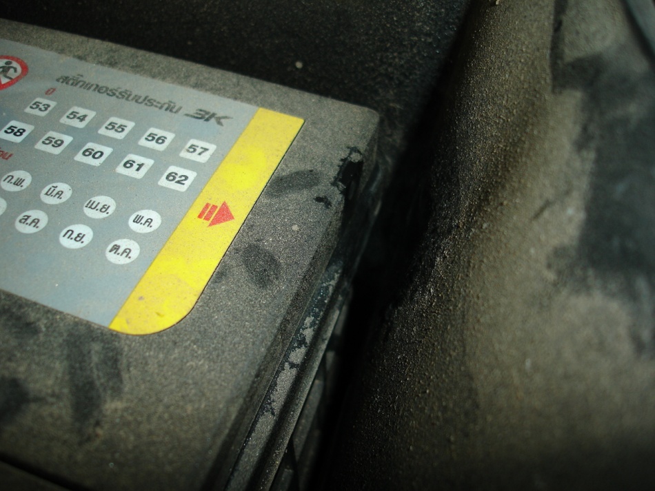 แบตเตอรี่ยี่ห้อหนึ่งไม่เปิดเผยชื่อ ใช้มา 15 เดือน (ซื้อเมื่อ 2/12/55) มีอาการสตาร์ตยาก ระบบเครื่องเสียงค่อนข้างใหญ่ มีแบตแห้งแท้ภายในรถอีก 1 ลูก ในห้องเครื่องใช้กึ่งแห้ง รถวิ่งใช้งานเที่ยวละ 7 กม. ความเร็วเฉลี่ยประมาณ 80/ชม. ชาร์จทุกเดือนเพราะห่วงระบบเครื่องเสียง วันนี้เกิดอาการแอร์ไม่เย็นก่อนอาการแรก เช็คแอร์เสร็จเกิดอาการสะตาร์ทยากหลายทีถึงติดได้ ช่างแอร์สันนิฐานเบื้องต้นว่าแบตเสื่อมมีผลทำให้แอร์ทำไม่สมบูรณ์ กลับถึงบ้านเปิดฝากระโปง ลองใช้ไฟฉายส่องดู ก็เจอตามรูป
